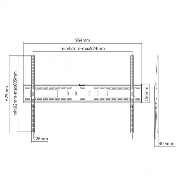 El soporte de pared fijo grande y de bajo perfil puede adaptarse a la mayoría de los televisores de pantalla plana LED, LCD de 60″-100″ con un peso máximo de 75 kg/165 lbs. El tamaño de pantalla aplicable es casi el doble que los televisores clásicos. El diseño delgado se encuentra a solo 30,5 mm de la pared para complementar el aspecto moderno de los televisores ultra-delgados. Su cerradura de resorte de clic automático con cordón de liberación fácil conecta las pantallas planas a la pared de manera fácil y segura. Compatible con orificio VESA hasta 605×924. Además, es adecuado para televisores curvos. La construcción simple permite una instalación fácil.